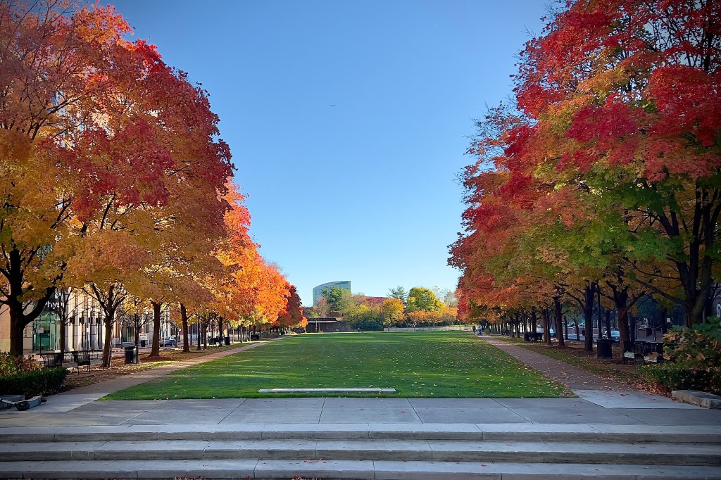 photo by me Recently, we were in Columbus, Ohio, to see a hockey match between their Blue Jackets and my Boston Bruins (a gift from my wife). Across from Nationwide Arena is McFerson Commons Park. The sun was casting its light on the trees in the background, which caught my eye, and since we had some time we took a little stroll before dinner. The courtyard was ablaze with rich colors.